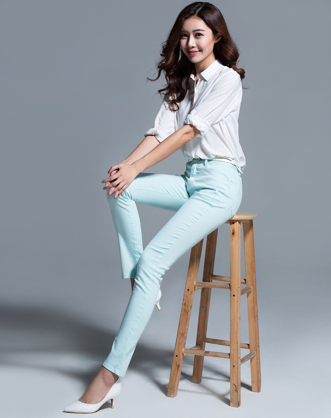 美女蓝色上衣搭配简约白色长裤性感写真