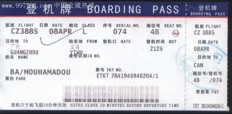 旧登机牌-杭州义乌机场cz3885航班-义乌-广州正面图