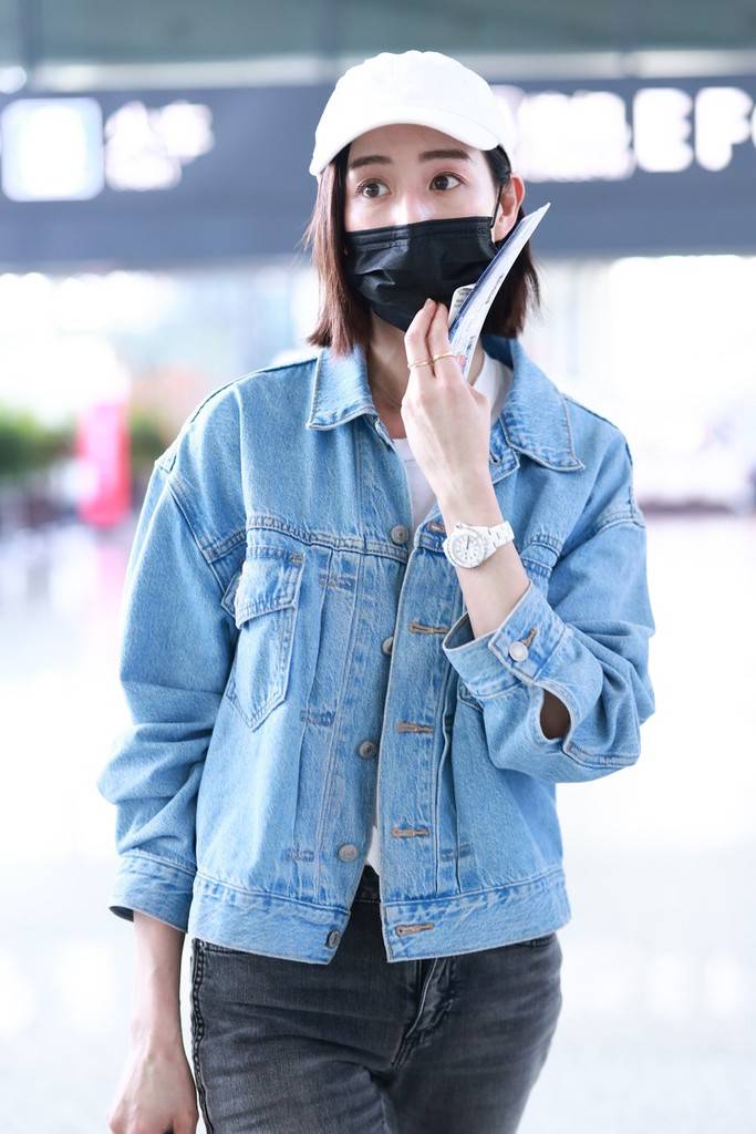 张钧甯身穿蓝色牛仔外套搭配修身牛仔裤机场现身