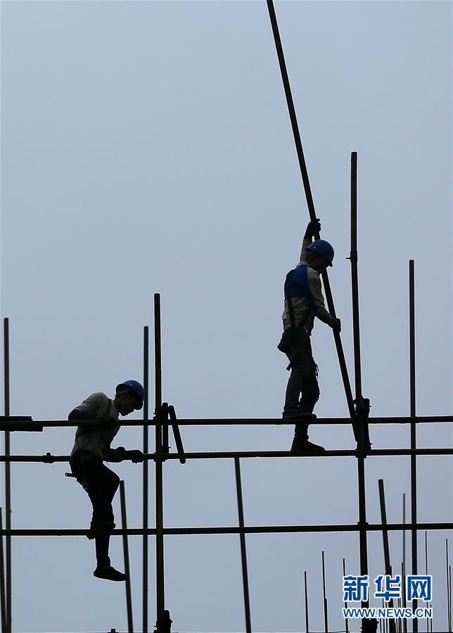 在建筑工地上,工人们矗立在高楼架构下,用汗水和努力完成着人们对美好