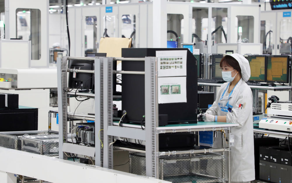 伟创力一期生产线上,工人正在进行操作.