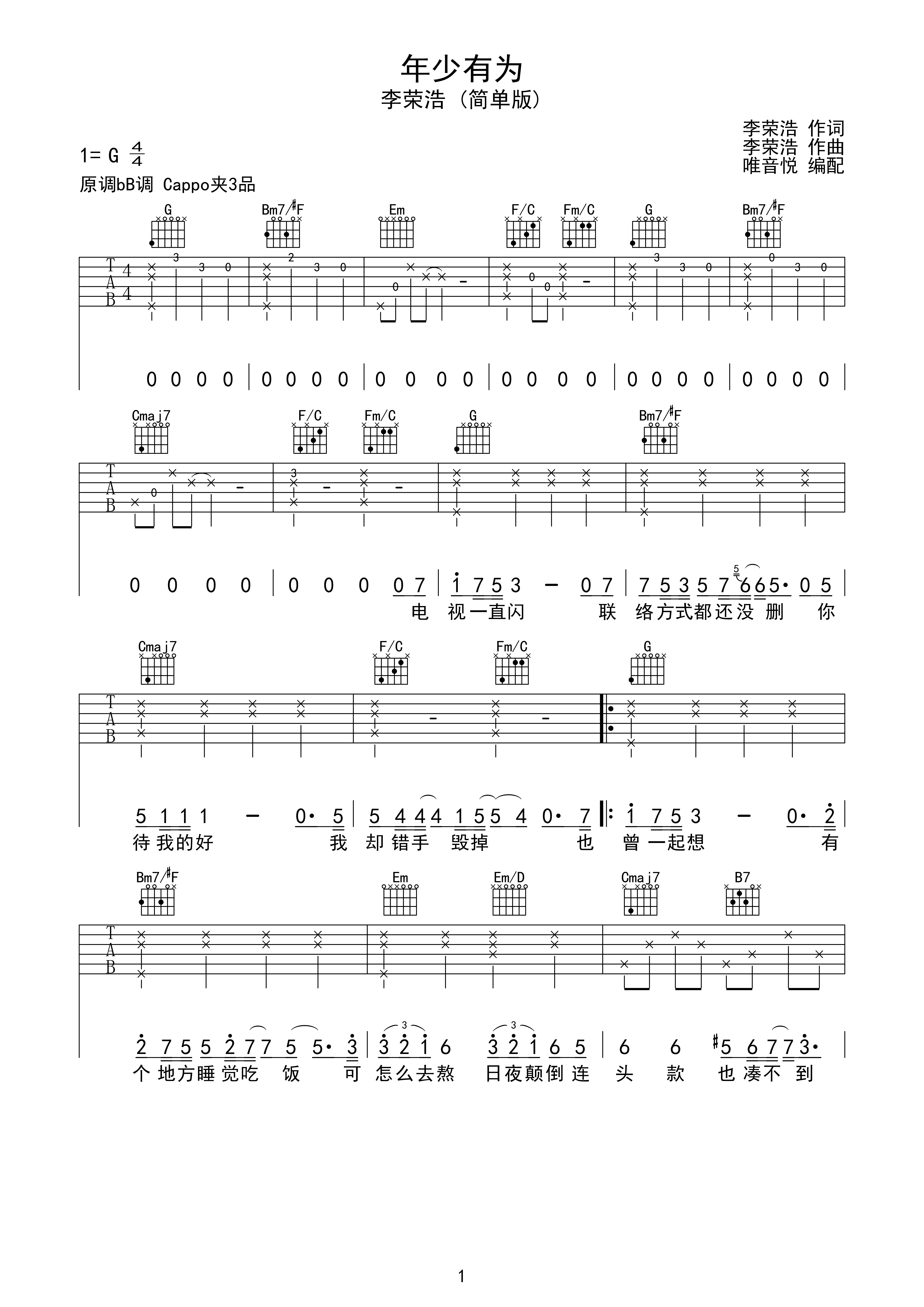 李荣浩 年少有为 g调超简单版吉他谱 唯音悦制谱g调六线pdf谱吉他谱