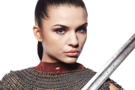 中世纪的女骑士,盔甲的肖像照片