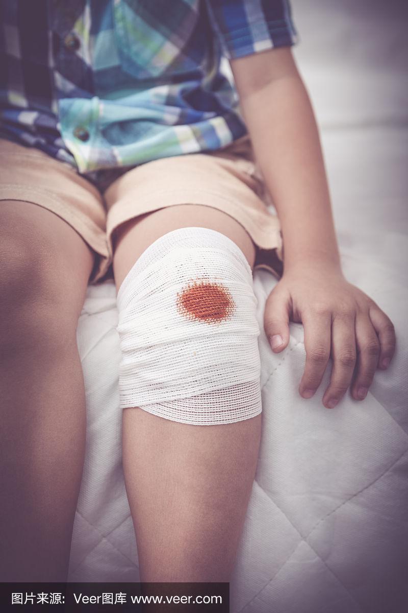 孩子受伤.孩子膝盖上的伤口用绷带包扎.