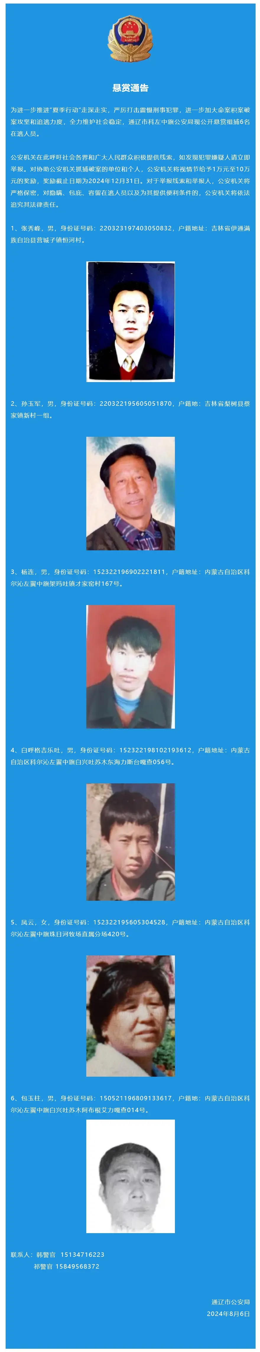 通辽警方悬赏通缉6名在逃人员,公布照片和个人信息:5男1女,最大68岁