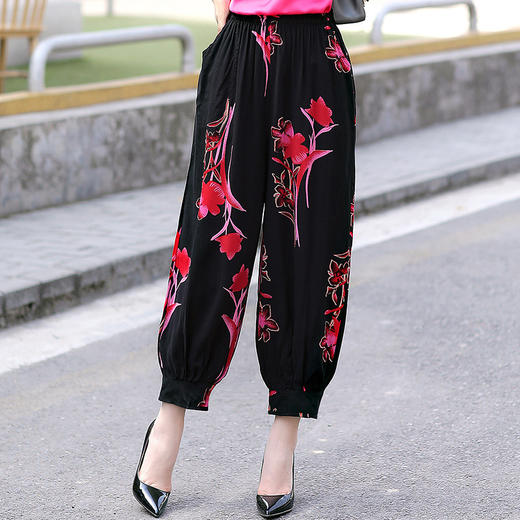 夏季新款绵绸印花灯笼裤人造棉薄款收脚口长裤休闲简约防蚊裤