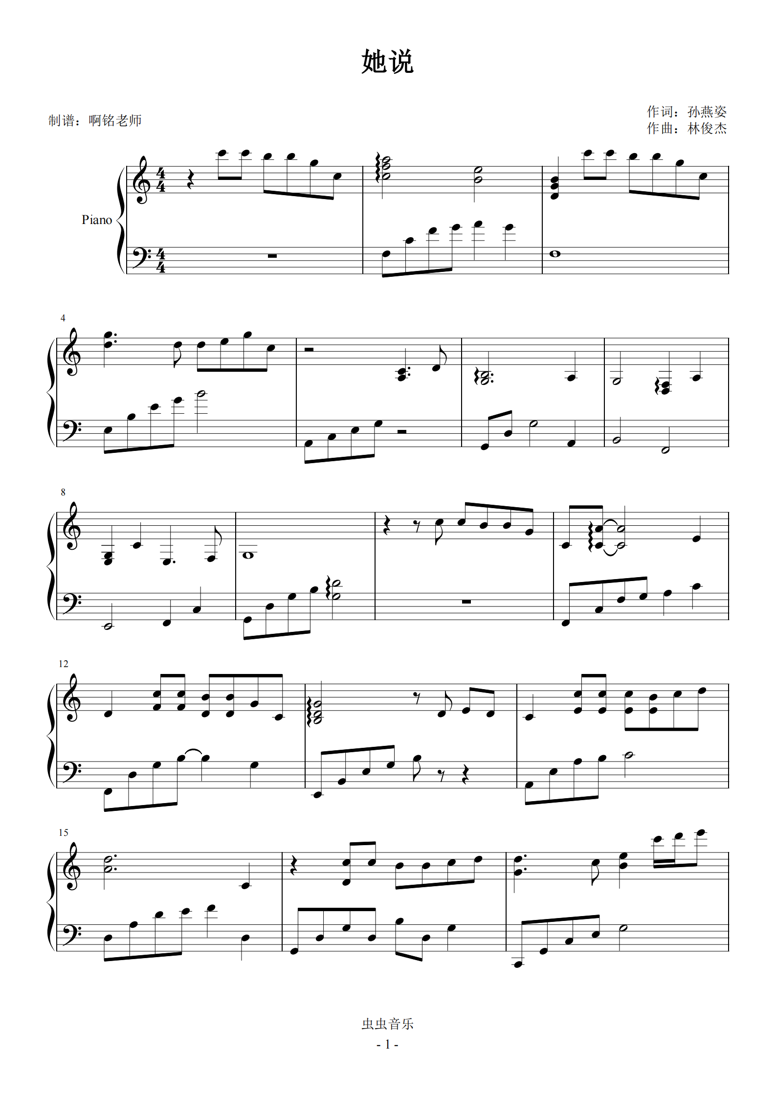 她说【唯美演奏版】钢琴谱-c调-虫虫钢琴