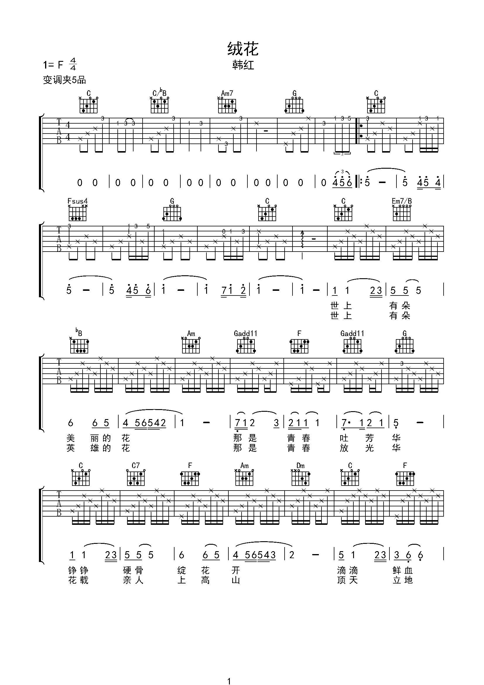 绒花-韩红 芳华片尾曲 带前奏f调六线吉他谱-虫虫吉他谱免费下载