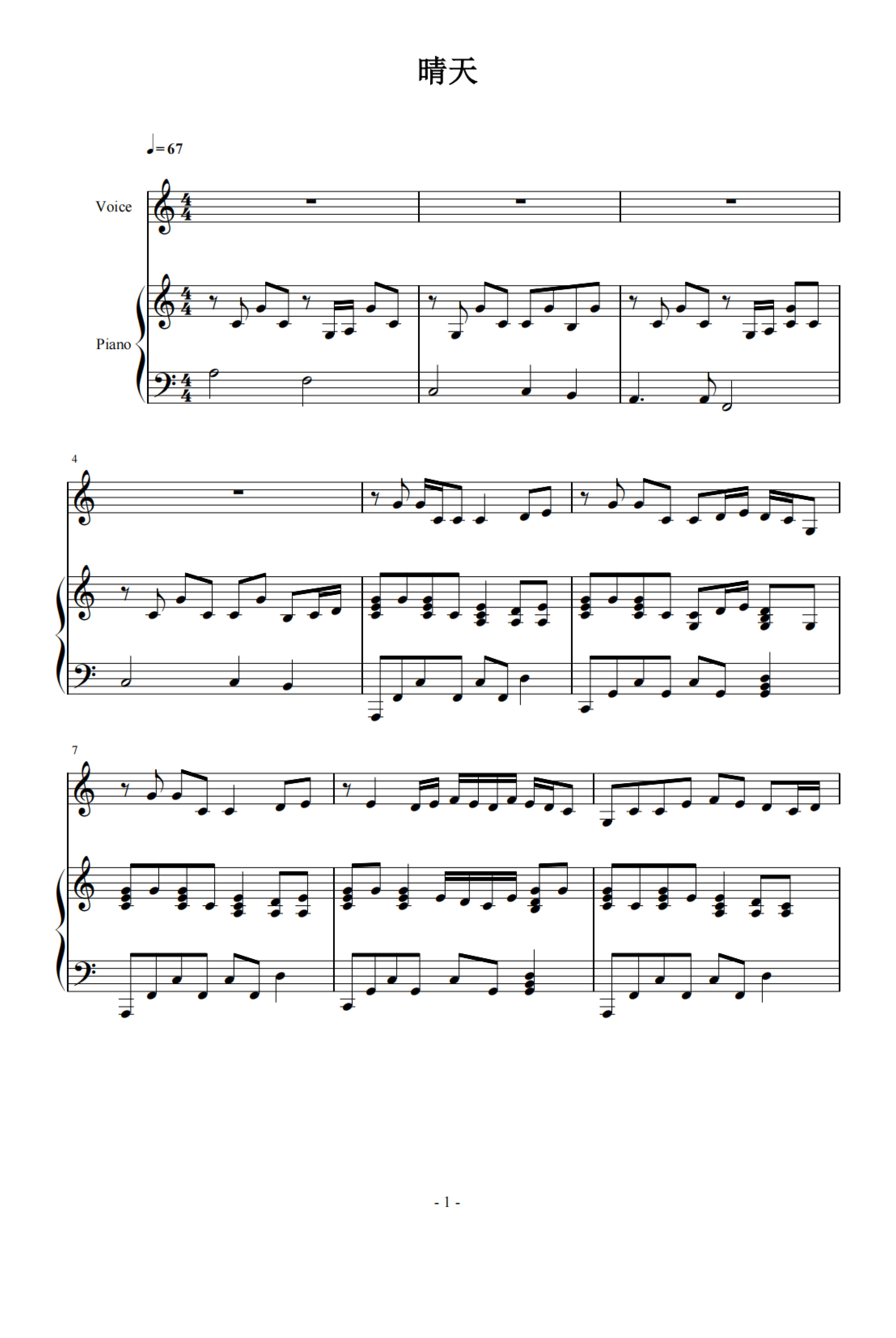 晴天钢琴谱.晴天五线谱 晴天简谱.