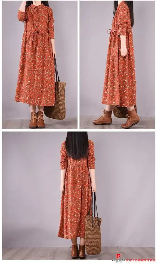 皮尔卡丹官方高档品牌女装亚麻连衣裙2022春秋复古碎花翻领收腰长袖
