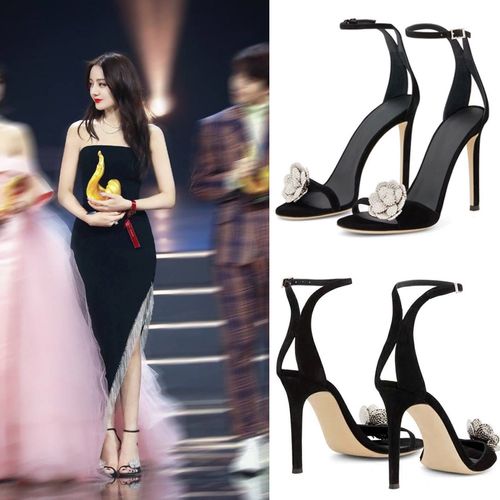 迪丽热巴明星同款一字带凉鞋女夏水钻露趾黑色高跟鞋细跟性感百搭