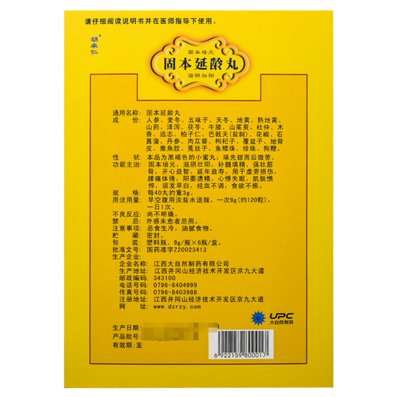 胡卓仁 固本延龄丸 9g*6瓶6056