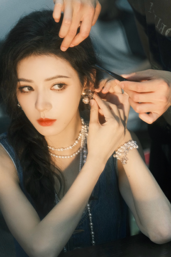叠戴#复古美少女@张予曦上线~ 深蓝牛仔服搭配珍珠项链,侧边编发绝美!