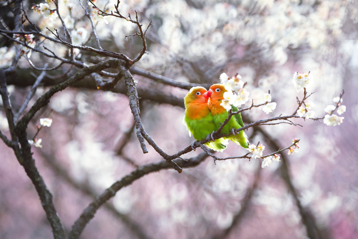 春天梅花树上的两只可爱小鹦鹉