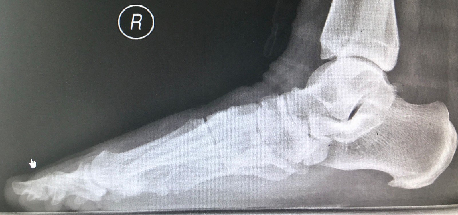 患儿,男,11岁,跟骨骨骺炎,跟骨侧位片可见跟骨骨