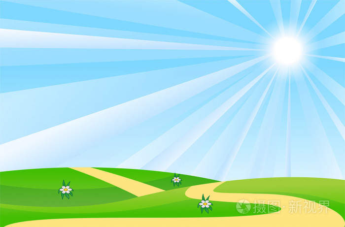 夏日风景与绿色的草坪和太阳在蔚蓝的天空插画-正版商用图片0bkco0-摄