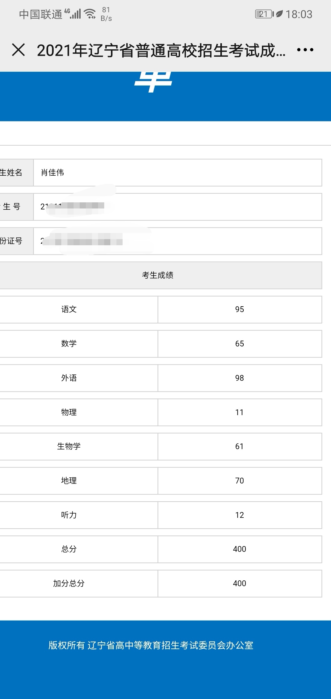 高考成绩辽宁省