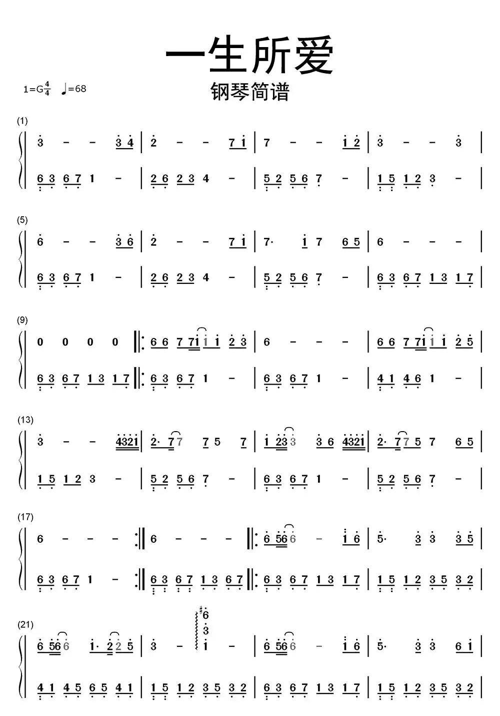 一生所爱钢琴简谱乐谱