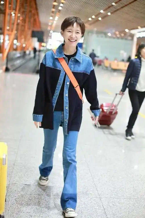 独特气质的焦俊艳穿牛仔套装走机场素颜依然高级又时髦