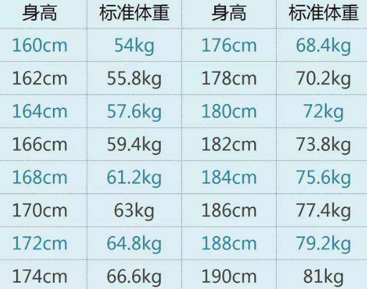 男性160cm以上标准体重表,越接近标准越健康,超标1项运动可弥补