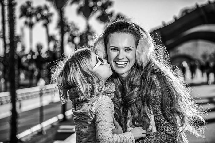 微笑母亲和孩子的游客,在巴塞罗那,西班牙接吻
