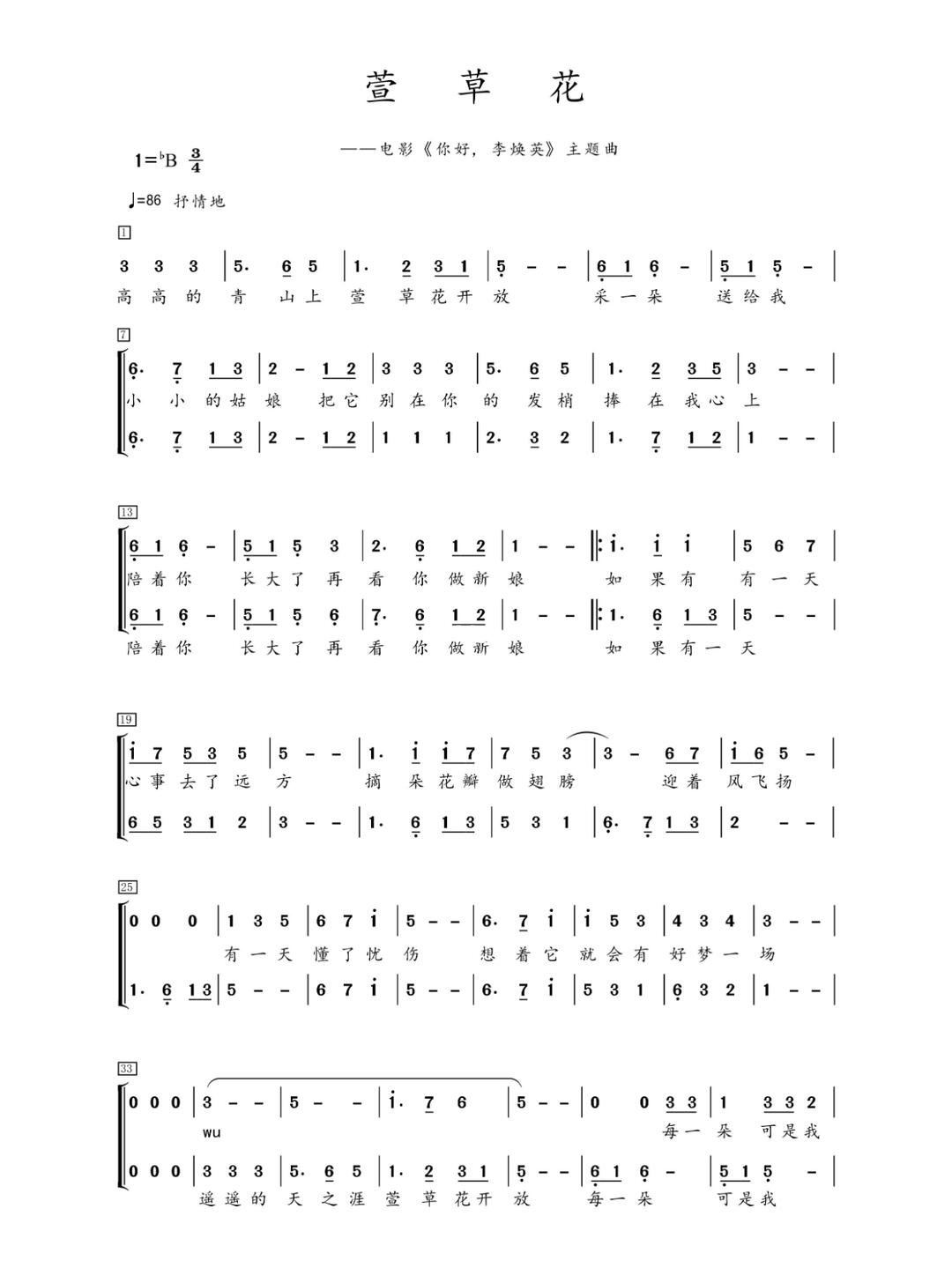 《萱草花》二声部 合唱简谱 简单版