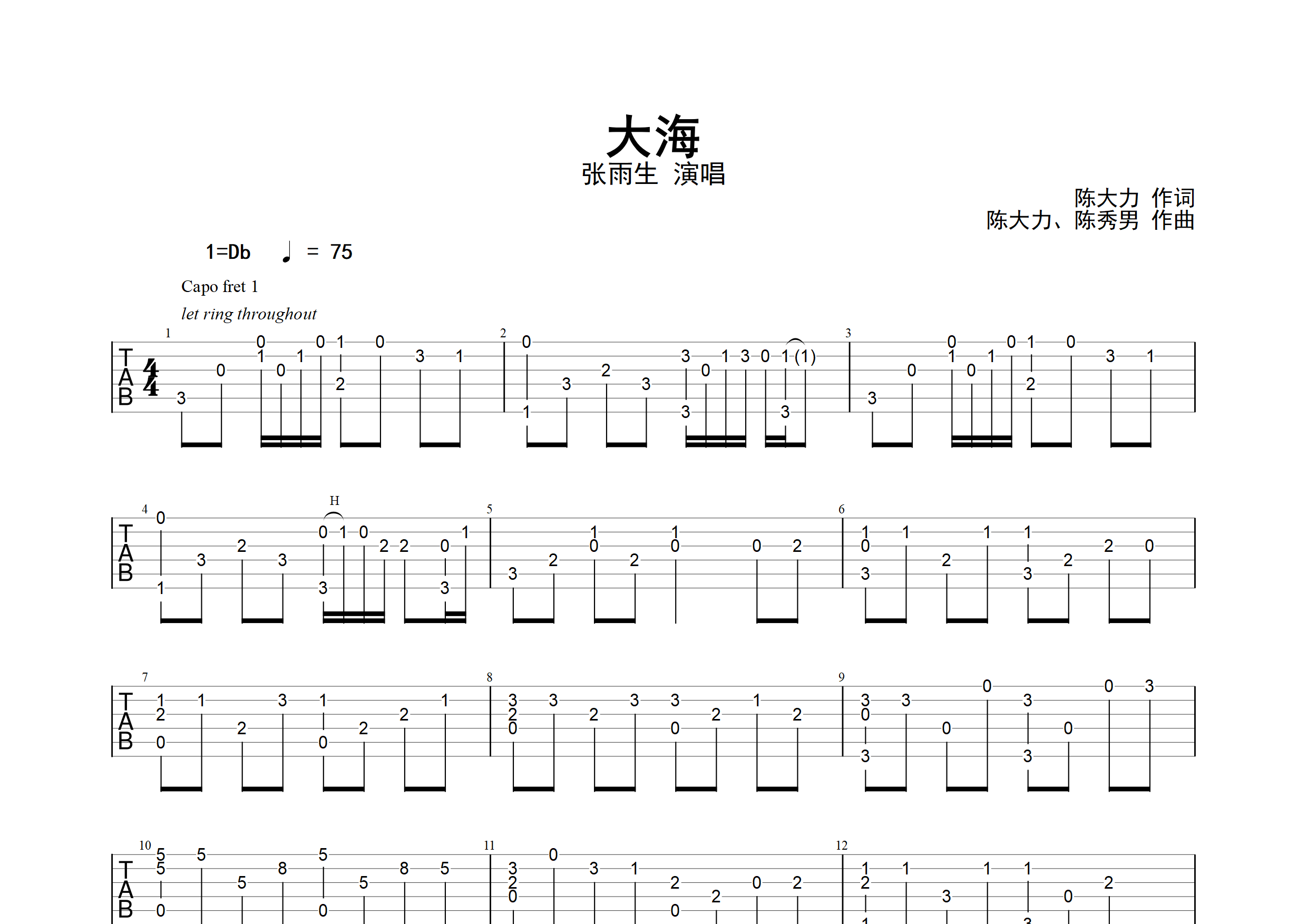 大海c调六线吉他谱-虫虫吉他谱免费下载