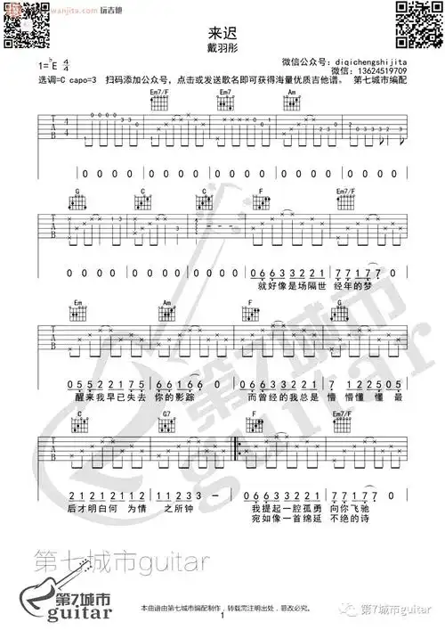 来迟吉他谱戴羽彤c调原版六线谱来迟吉他弹唱谱