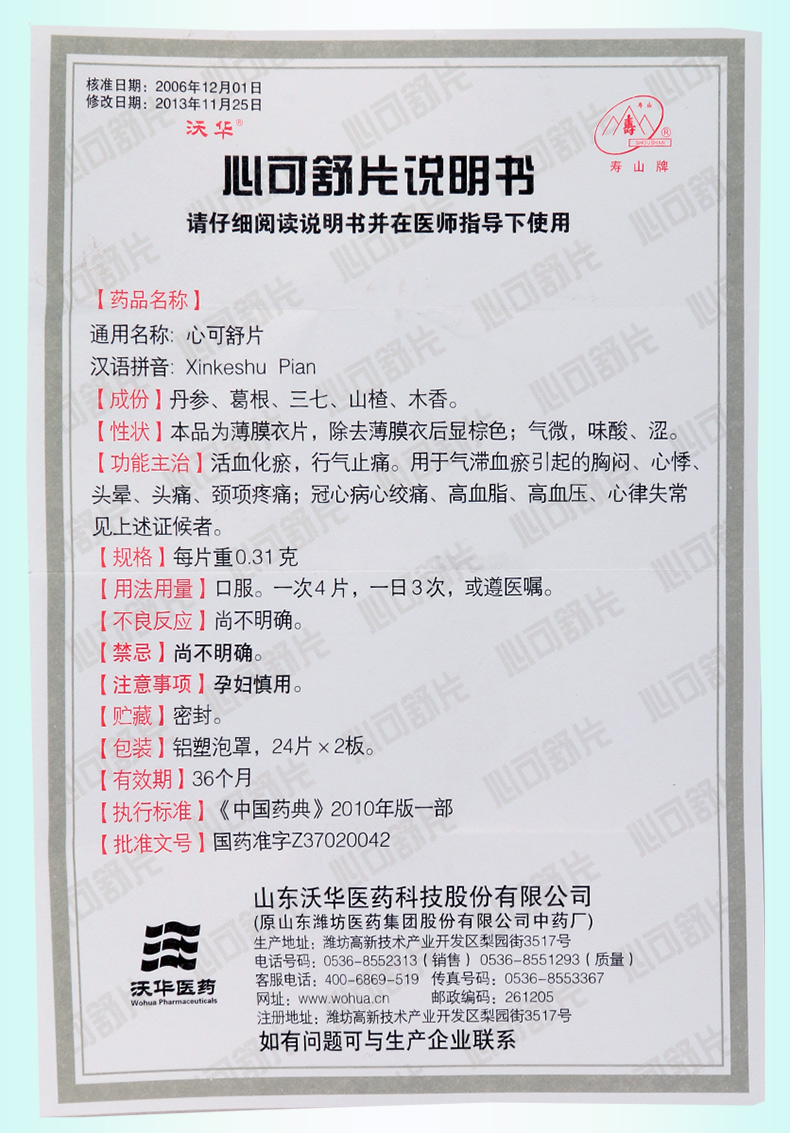 沃华心可舒片031g96片盒冠心病心绞痛高血脂高血压心律失常