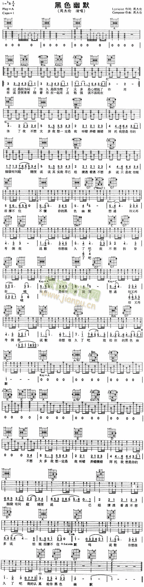 黑色幽默吉他谱周杰伦