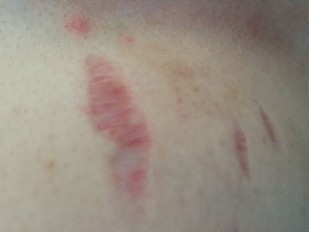 我的右胸乳沟旁一处皮肤凹进去了还有明显的红血丝,这是什么症状?
