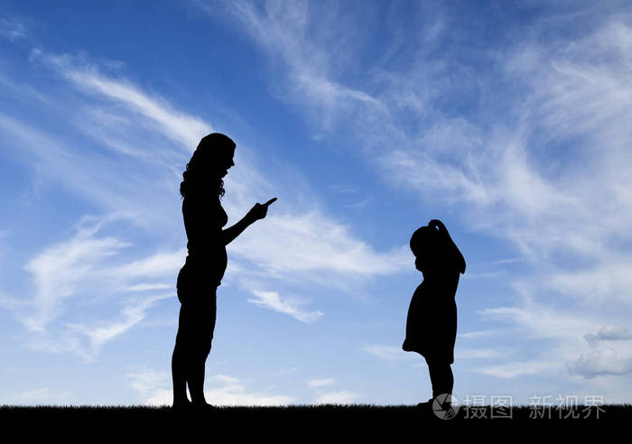 剪影, 小哀伤哭泣的女孩孩子和母亲尖叫对她.对虐待儿童的概念性描述