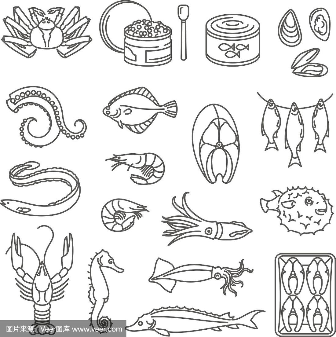 海食品图标设置矢量.现代,线,涂鸦风格.孤立在白色背景上的海鲜集合.