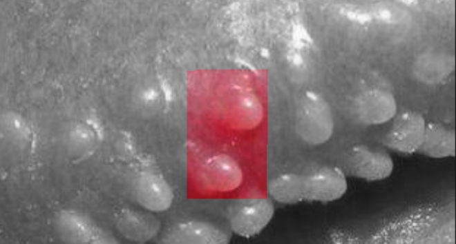 尖锐湿疣的舌部皮损初起为单个或多个散在的淡红色小丘疹,质地柔软