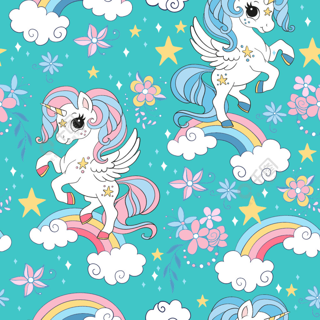 无缝图案与可爱的独角兽云彩彩虹和星星与独角兽的魔法背景时尚色彩的