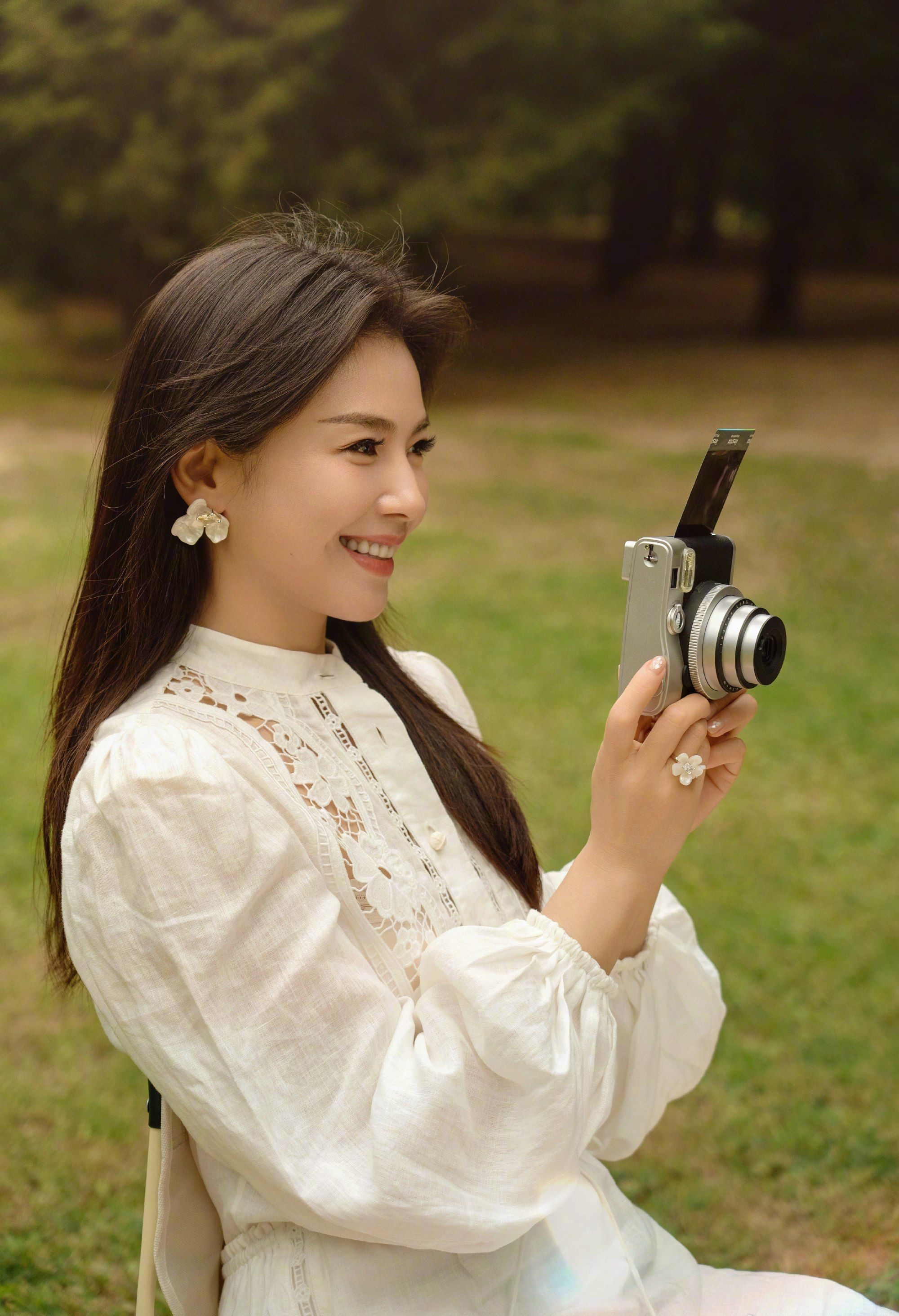 刘涛披肩长发白色套装户外野餐生活照