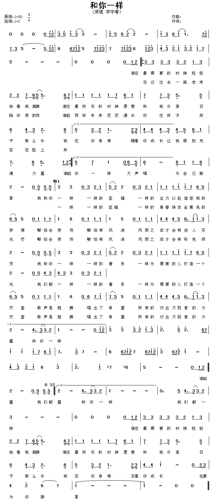 《和你一样》歌谱(简谱)是什么?