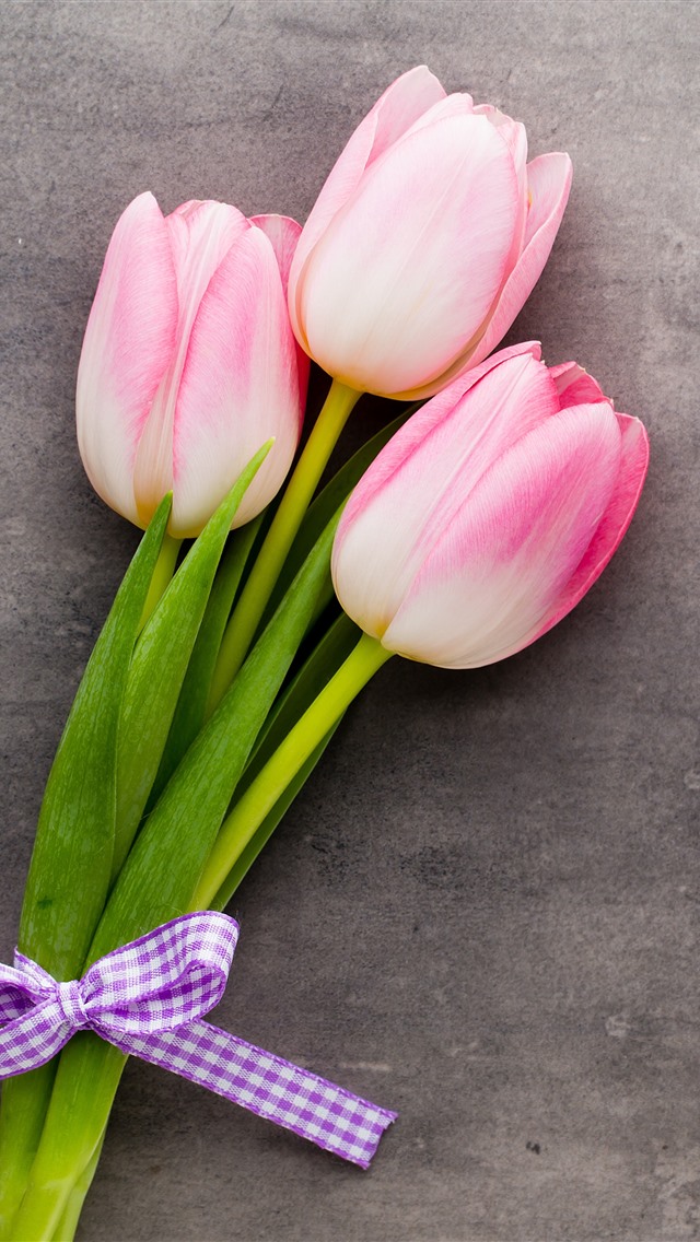 三个粉红色的郁金香,花束,灰色背景 5k