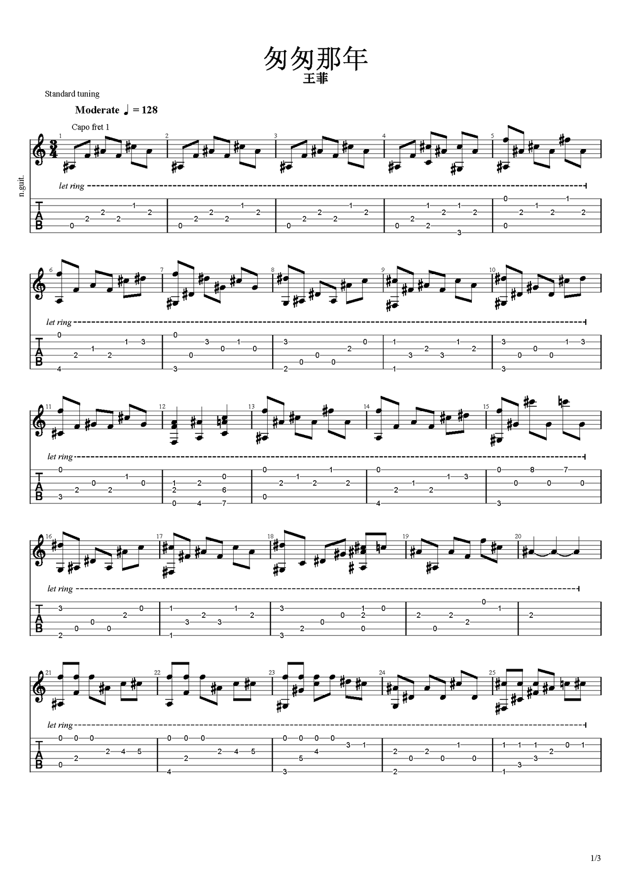 匆匆那年吉他谱-王菲-指弹版高清六线谱图片谱