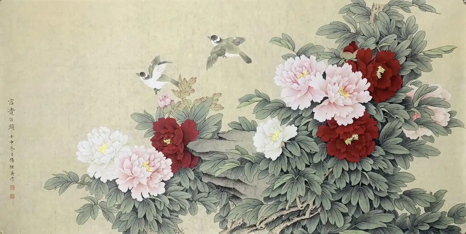 傅继英工笔画花鸟画富贵白头壬申冬月作