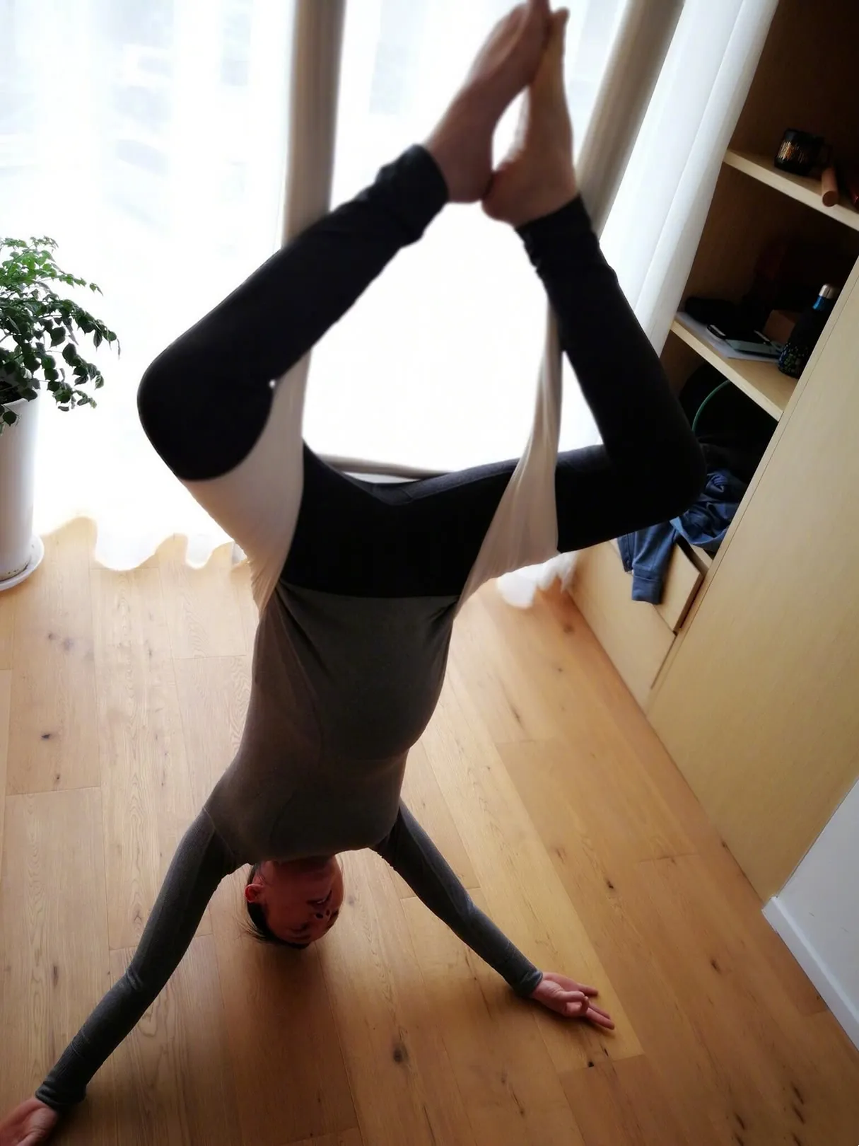 43岁蒋勤勤怀二胎做瑜伽,挺巨肚劈叉倒立