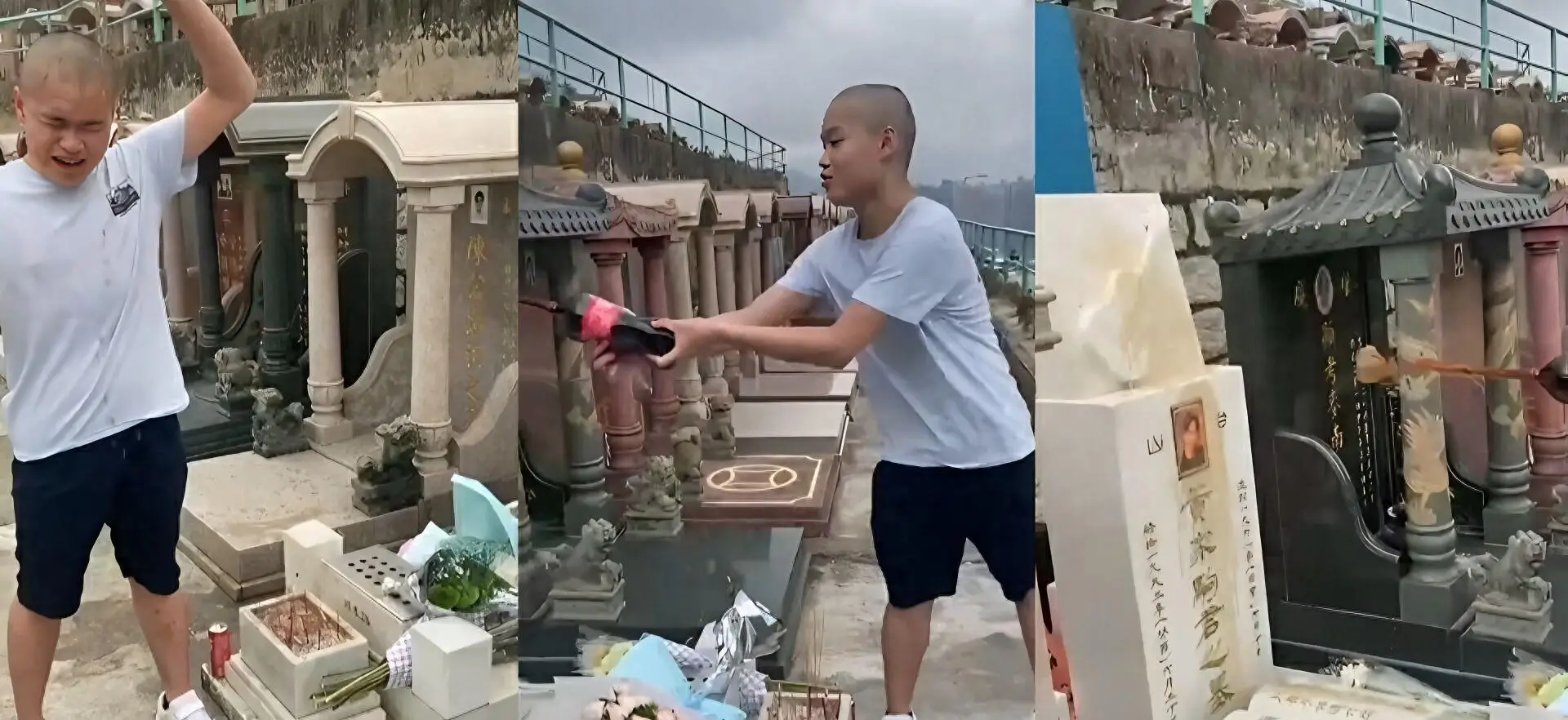 关注黄家驹墓碑遗照被砸事件:女粉丝崩溃痛哭,光头男有不雅前科