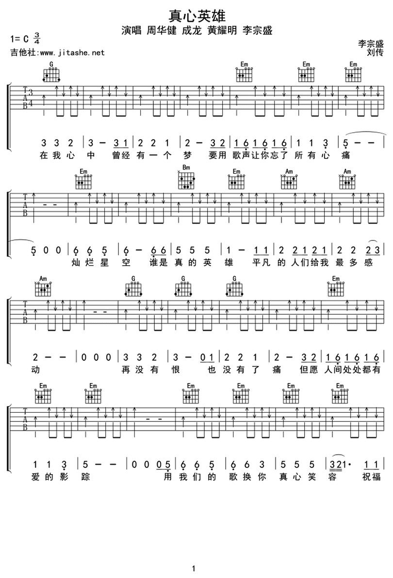 周华健成龙黄耀明李宗盛真心英雄吉他谱