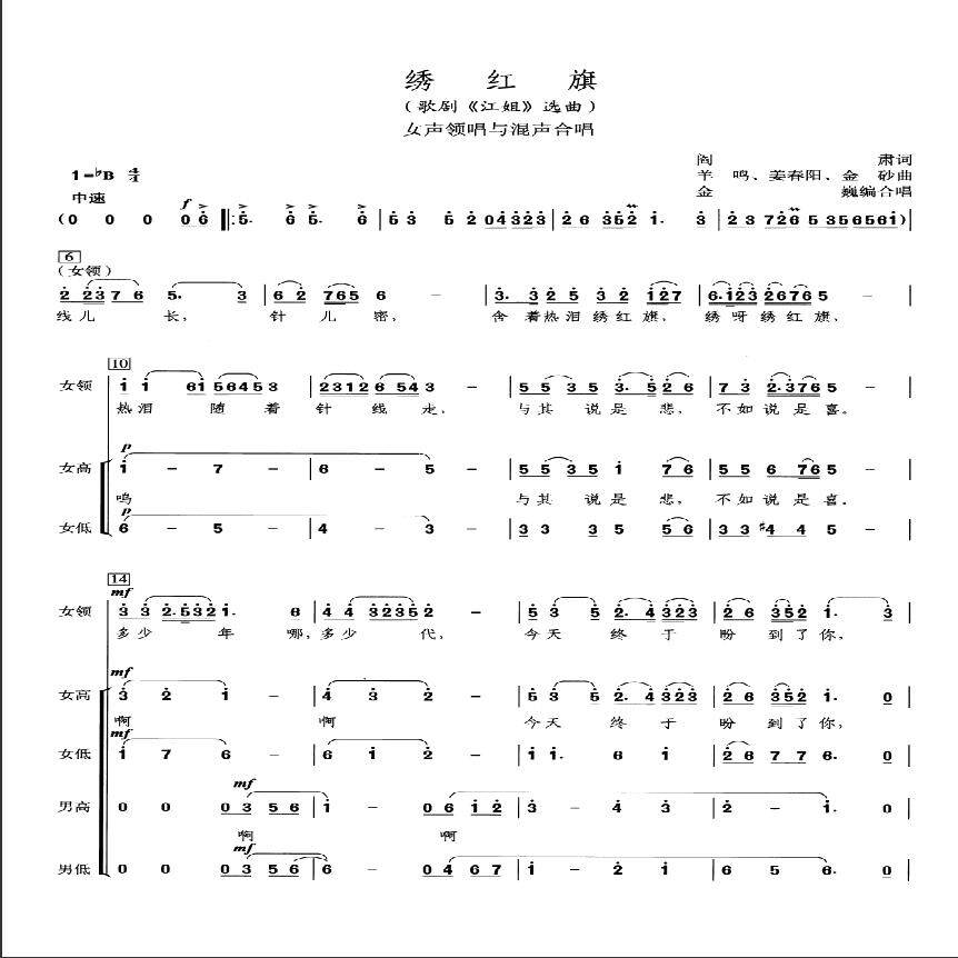 中国交响乐团合唱团 绣红旗 金巍混声合唱简谱 降b调钢琴五线谱