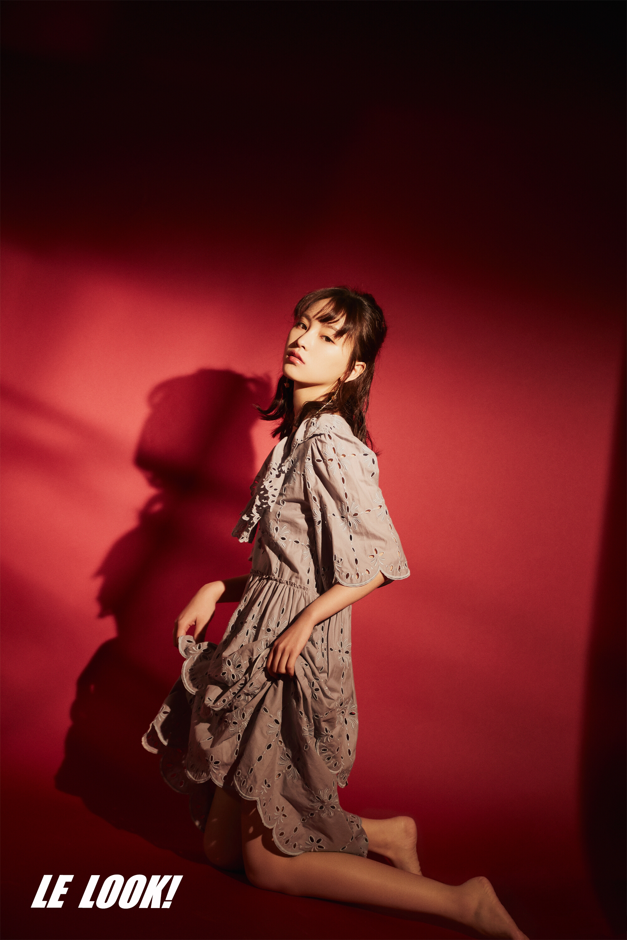 杨紫身穿牛仔套装,以路边的绿化带景致为背景,拍摄出一组青春洋溢的美