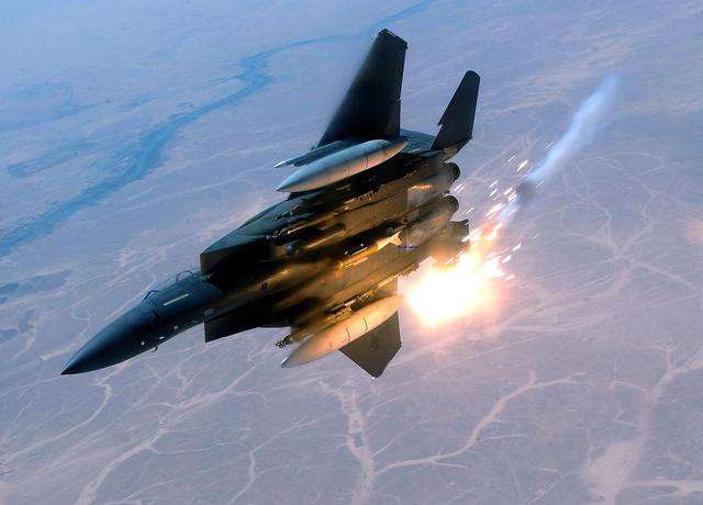 图为某空战电子游戏中的f-15战斗机使用其激光武器吊舱开火.