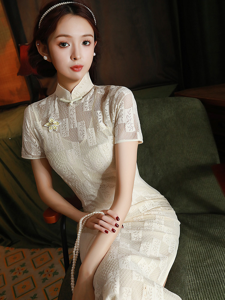米白色蕾丝旗袍2023年新款夏季改良复古中国风高端气质长款连衣裙