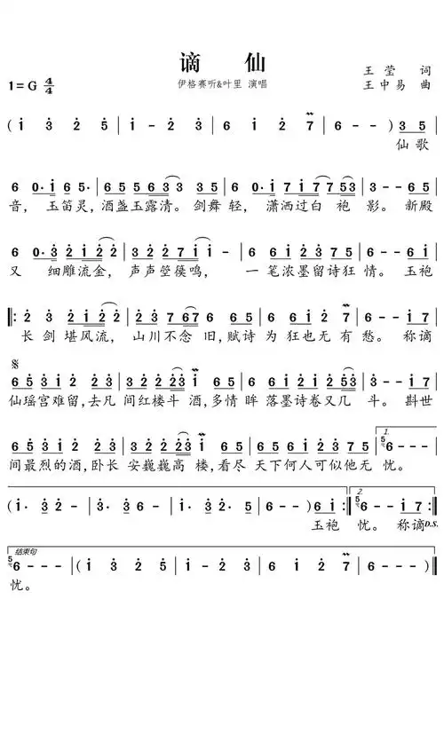 《谪仙》简谱 王莹作词 王中易作曲 叶里演唱 伊格赛听演唱 第1页