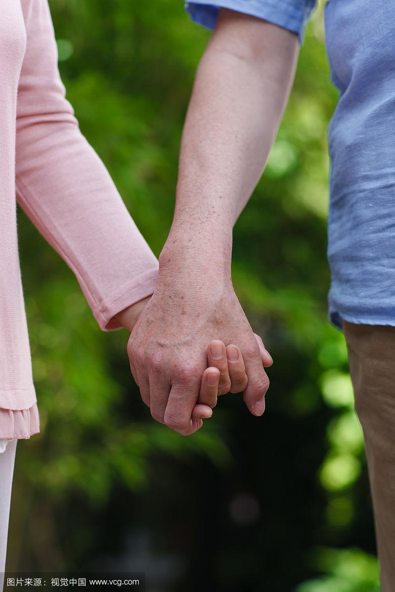浪漫的老年夫妇手牵着手