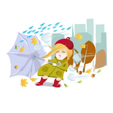 可爱的孩子穿着暖和的衣服迎接秋天.你好秋天.矢量插图
